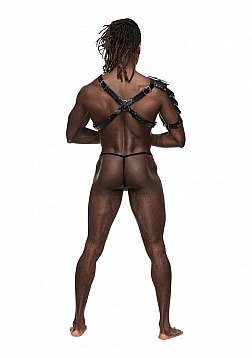 From the Leather collection by Male Power, this style includes a criss crossing chest harness with a gladiator inspired, bendable shoulder shield, fully adjustable buckled straps, metal rings and studs.