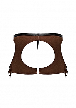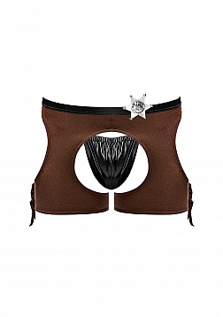 From the Costumes collection by Male Power, this style includes: A three piece set featuring adecorative bandanna, clip-on badge, short chaps with cire waistband, and a posing strap with comfort fit pouch, elastic waistband, and g-string back.