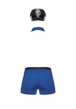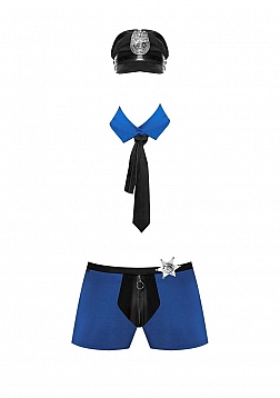 From the Costumes collection by Male Power, this style includes: A three piece set featuring a short with a contrast pouch, functional zipper with protective lining, O-ring slider, and a cire waistband, a clip-on badge, and a collar with attached tie.
