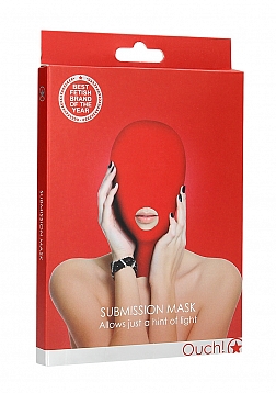 This comfortable Submission mask is designed to stretch completely over the head. The fabric allows just a hint of light in while impairing vision and awakening other senses. The shiny hood can be worn by him or her, and the thin lightweight fabric makes breathing and hearing a snap. Best of all, you still have access to your subject's mouth!