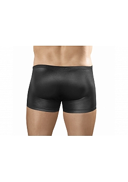 Stretch mini short features comfort fit pouch, functional zipper in front with decorative oval slider and plush elastic waistband and trim. Machine wash separately, cold water, gentle cycle. Do not bleach. Tumble dry low heat.