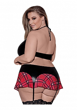 From the Dress Up collection by Magic Silk, this style includes: A halter vest with skirt featuring attached garters & chain detail, matching plaid tie and black G-string.