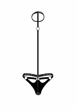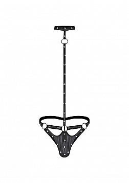 Tormentor features one piece choker g-string with contour peek-a-boo panel pouch, ringed cire waistband with center attached t-strap choker with velcro closure, decorative studs and g-string back.