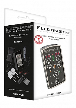 The ElectraStim Flick EM80-M pack includes a Flick Duo dual-channel stimulator, all required cables, a set of 4 ElectraPads, 2 ElectraLoops adjustable cock rings and a Silicone Noir Aura electrode (suitable for vaginal and anal use).