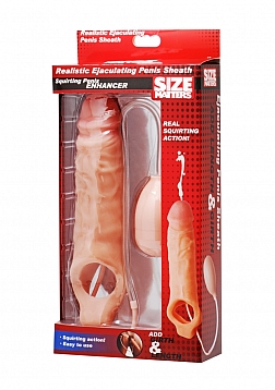 Get ready for the ultimate in instant and realistic penis enlargement with this squirting, ejaculating penis sheath! Not only does it give you extra length and girth instantly with a realistic look and feel, but with a squeeze of the hand pump you can shoot a load into or onto your partner, for an explosive climax. Fill the pump with whatever liquid you desire. It can hold up to 60ml so you can blow load after load until you are completely spent. The flexible rubber is stretchy enough to accommodate most sizes, while remaining firm enough for some serious penetration. The veined shaft offers thrilling texture and the smooth pink cock head adds to the lifelike look. The inside is lined with large texture nodes for more sensation, tightness, and grip. Now you can get your fill of lifelike penetration with an orgasmic climax with this ejaculating penis sheath!