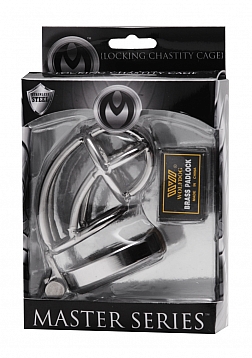 This erection inhibiting device is made of durable stainless steel and features a shortened cage with a locking base piece. Simply place him in the cage and fasten the base ring using the simple pin mechanism. The hinged base ring has a rubber sleeve at the joint to prevent pinching. Then just place the pin through the top of the cage and secure him with the included lock and keys. You decide when he is free...