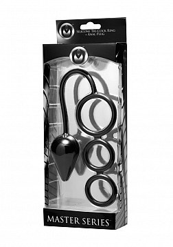 This darkly sexy plug provides power to your cock while filling you up with anal pleasure. The triple ring system provides superior blood retention, for your strongest, biggest, longest lasting erection. The tapered plug has a thin tip for easy insertion, with a teardrop design for increased stimulation. Just slip the largest ring behind your cock and balls, the middle ring over your shaft, and the last ring over your scrotum. Now you have three times the power of a traditional cock ring, as the premium silicone plug stimulates you from the inside. The thin arm keeps the plug from slipping, and provides easy retrieval. Get the most out of your hard on with plenty of pleasure with the Triple Threat Silicone Tri Cock Ring. Clean after use with mild soap or toy cleaner. Do not use with silicone lubricants, only water-based.