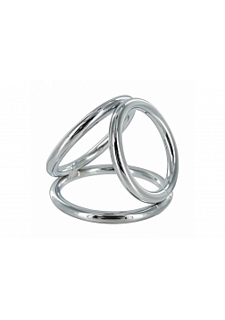 The Triad Chamber brings the art of domination in threes. This chrome cock cage features three differently sized O-rings with which you can ensnare your pet. The largest ring goes around the cock and balls like a normal cock ring. The middle sized ring goes around the balls, providing the wearer with a pressure sensation. The third ring goes around the base of the penis to help you maintain the kind of erection that lasts for extended sessions. The Triad Chamber is perfect for the experienced user who wants a sleek and modern look, but seeks a weighted, more supportive cock ring.