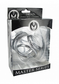The Triad Chamber brings the art of domination in threes. This chrome cock cage features three differently sized O-rings with which you can ensnare your pet. The largest ring goes around the cock and balls like a normal cock ring. The middle sized ring goes around the balls, providing the wearer with a pressure sensation. The third ring goes around the base of the penis to help you maintain the kind of erection that lasts for extended sessions. The Triad Chamber is perfect for the experienced user who wants a sleek and modern look, but seeks a weighted, more supportive cock ring.