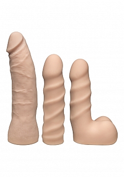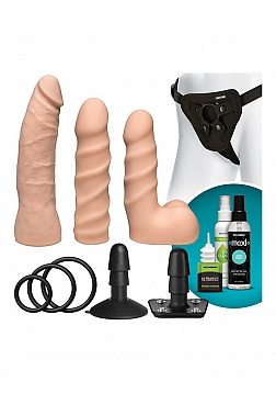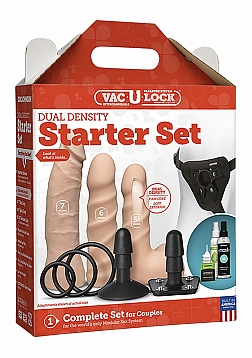 Your perfect strap-on experience is on lock with Doc Johnson's deluxe line of full-service Vac-U-Lock Harness Sets.  The Vac-U-Lock Dual Density Starter Set provides a fun and innovative introduction to strap-on sex with a complete harness with removable o-rings and plug, three moderately-sized ULTRASKYN attachments and a bottle of Mood water-based lube. These dual density attachments warm to body temperature with use and feature a soft, pliable exterior that gives way to a firm inner core, recreating the feel of a real erect penis. Begin your exploration with the pleasing ridges and plush balls of the 5.5 inch textured cock, or go a bit deeper with the 6 inch spiral dong. For the strongest and most lifelike sensation, choose the 7 inch thin dong's realistic proportions, contours, and vein details.  Attachments can be used with the harness, the included Vac-U-Lock suction cup, and any other accessory or harness in the line. The Vac-U-Lock Dual Density Starter Set also includes Doc Johnson Natural Toy Cleaner and ULTRASKYN Refresh Powder to properly and hygienically maintain your dual density ULTRASKYN attachments. Every product in the patented Vac-U-Lock system is designed to help you create any strap-on or toy you're in the mood for, and it's as simple as popping on the attachment of your choice.