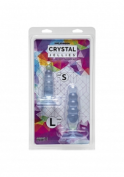 Explore your backdoor with confidence! With a small and medium plug, the Crystal Jellies Anal Trainer Kit is the perfect fit for anal play beginners. The small plug is 3.5" in diameter with 3.75" insertable length, the large plug is 4.25" in diameter with 4.75" insertable length. These plugs feature a wide flared base for safe and comfortable anal play. Crystal Jellies are made from phthalate-free body safe material, which includes Doc's antibacterial Sil-A-Gel formula. Proudly made in America.