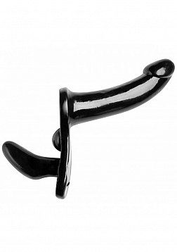 This double sided strap on dildo lets you and your partner enjoy mutual pleasure in a sleek, slick design. The phallic outer dildo is made of smooth, gleaming PVC, made to glide in and out easily. The inner dildo is demurely sized, but expertly curved, designed for G-spot stimulation, with an additional sensory bump that will press and rub against your clit with every thrust. There is a slot at the bottom which allows you to thread the thong-style harness through. Just place the dildo through front hole, the strap through the bottom, and ride your way to simultaneous satisfaction! The harness adjusts at the sides and back, and fits waists up to 41 inches in circumference.