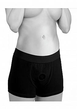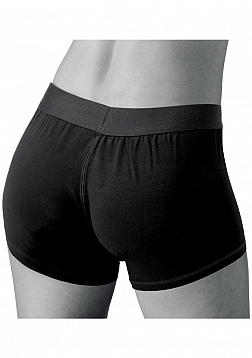 Feel more comfortable and stylish than ever before when you strap on your favorite dildo. This boxer brief style harness feels just like underwear, with an O-ring that stretches to accommodate most dildo sizes. You can even wear these cotton shorts out under your clothing, or stuff them with your favorite packer. This harness is excellent for extended wear. The supportive elastic waistband will carry the weight of your dong and you will be allowed greater mobility and position versatility. This harness is recommended for use with dildos that have a flat base that is 1.75 inches or wider. Machine washable.