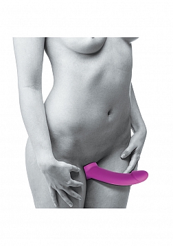 This vibrating silicone strap on dildo requires no harness, so nothing comes between your lover and you but your pleasure. Completely strapless, it stays in place with an insertable, curved probe, delivering delicious G-spot stimulation to the wearer. Just flex your PC muscles and let the powerful bullet send pleasure buzzing into you as you penetrate your partner with the same vibration! The bullet has a simple one-touch power switch, sending powerful sensations from the bulbous penetrator to the long, curved shaft. The smooth, rigid silicone is silky for easy insertion, with a semi-phallic shape and curved shaft for G-spot or P-spot stimulation. Furthermore, the wearer can grid against the textured clitoral pad as the thrust in and out of their partner, finding greater satisfaction than ever before! The waterproof design lets you use it in the bath or shower, with or without the vibrating bullet. Now you can both enjoy strong vibration, comfortable penetration, and immense bliss together!