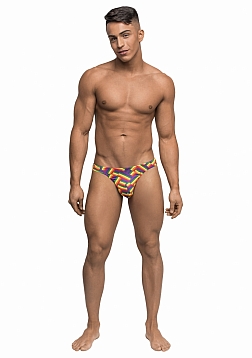 From the Pride Fest collection by Male Power, this style includes: A bong thong with a low rise waist featuring our contoured comfort pouch, one-inch sides, and a T-back. Multicolored festive rainbow print in a herringbone pattern. Stretchy and breathable, lightweight poly spandex.