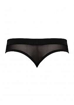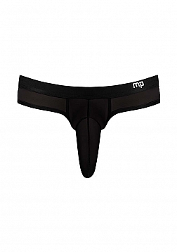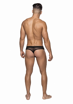 Thong, low rise waist, 1 inch back, plush cotton waistband, stamped logo, shaft pouch