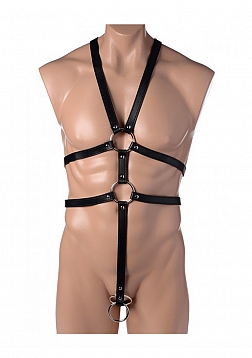 Strap into this full-body harness, designed to wrap seductively around your body and cock! Three adjustable straps ensure that this sexy bondage accessory fits most male bodies, with two cock rings that allow you to put your entire package through one, and just your cock through the other. Loom intimidatingly over your lover in this unique harness, or service your Master or Mistress. This device is perfect for those who fall into either Dominant or submissive roles.
