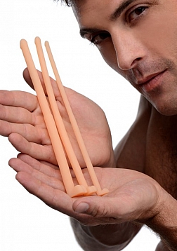 These penis-shaped sounds give you three options to play with. Work your way up from the small urethral insert to the large to experience unique sensations of pleasure. An increase in size occurs halfway down each shaft. They are textured with a bulbed head and veins, very subtly in the smallest and most prominently in the largest. Made of flexible silicone, these sounds are body-friendly and comfortable to use.