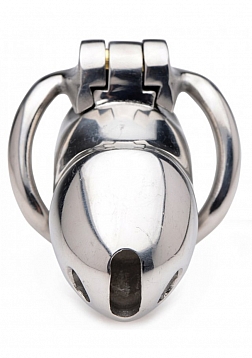 Keep your slave confined all day and all night! This chastity device has a uniquely compact design, with an internal locking system that prevents a bulky appearance under clothing. Insert the key into the brass keyhole and turn to straighten out the lock. The lock can then be inserted into or removed from the hinge. With another twist of the key, your slave will be helplessly trapped until you decide to show mercy! Great for sissification, cuckolding, and slaves. Made of stainless steel, this cage is non-porous and phthalate-free.