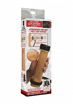 Add some exquisite texture to your milking experience! This attachment cylinder is an upgrade for your Milker Automatic Stroker Machine, with rows of textured beads for extra pleasure. Lined with supple rubber for a tight seal and realistic strokes, this cylinder accommodates the entire length of your shaft as it sucks on it. Tease yourself towards climax or play with a partner. Use with only water-based lubricants and clean with mild soap and warm water.