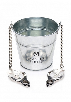 The Slave Bucket is the perfect BDSM accessory for wicked games with your partner. Combining the design of classic clover clamps with a bucket that hangs from chains, the more weight you add, the stronger the pinch and pull will be. Tease your sub with each pebble, coin, or drop of water that goes into the bucket. This devious device is perfect for nipples or labia, but can be used anywhere you desire!