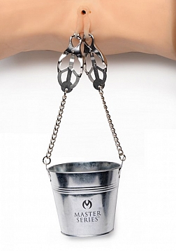 The Slave Bucket is the perfect BDSM accessory for wicked games with your partner. Combining the design of classic clover clamps with a bucket that hangs from chains, the more weight you add, the stronger the pinch and pull will be. Tease your sub with each pebble, coin, or drop of water that goes into the bucket. This devious device is perfect for nipples or labia, but can be used anywhere you desire!