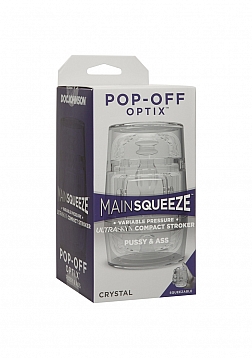 See yourself in a whole new way. This unique double-ended addition to the Optix category of Main Squeeze variable-pressure strokers features lifelike ass and pussy openings in the collection's unique transparent design, scaled down to fit in the palm of your hand. Pop-Off's hard plastic case and tight, textured ULTRASKYN™ insert offer the same visually stimulating experience and squeezable, tightness-controlling grip as the original in a discreet compact size.