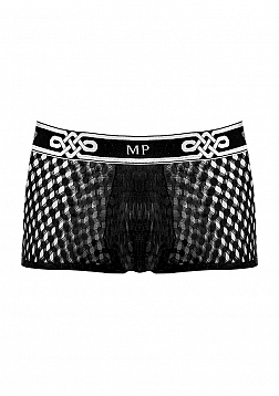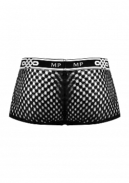Mini pouch short with lined pouch, waist, high cut legs, new plush MP logo'd waistband.Feather light with soft stretch, open weaving offers a peek a boo effect and features a new MP logo'd plush elastic waistband.