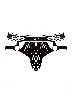 Ring jock with plush elastic leg bands attached to decorative metal rings, new plush MP logo'd waistband. Feather light with soft stretch, open weaving offers a peek a boo effect and features a new MP logo'd plush elastic waistband.