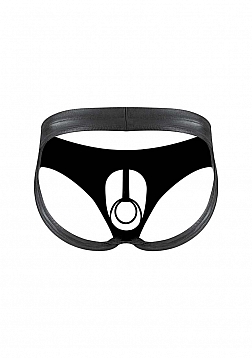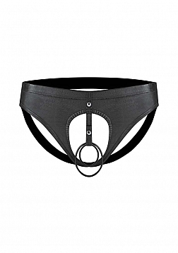 Double ring jock features 2 detachable rubber ringsLeather look Cire in a poly spandex blend.