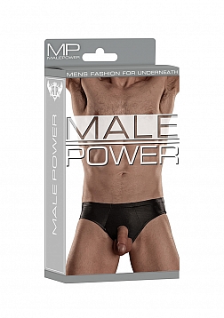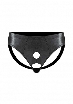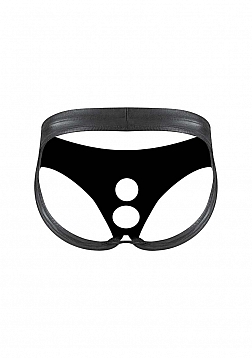 Prolong jock features double holes in a backless bikini Leather look Cire in a poly spandex blend.