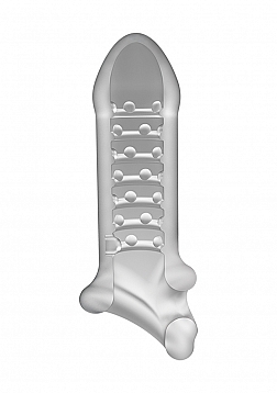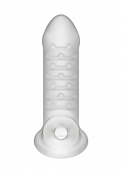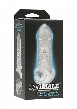 Sometimes you just want a little more. Slide into the OptiMALE™ Thin Extender with Ball Strap for increased length and thickness. Soft and stretchy to perfectly hug your shaft, this size-boosting sleeve stretches six inches from its ball-teasing base to a firm head in a sheer, frosted material that looks and feels incredible. The extender's ribbed, studded interior stimulates the penis, while the attached ball strap holds it in place and tugs at the balls for added pleasure with every thrust.