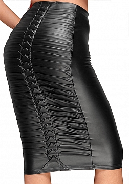 Terrific powerwetlook skirt has two-way zipper all the way down in the front. The back of the skirt is made of handmade pleats that underline your feminine figure.