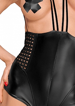 Cheeky powerwetlook body with decorative chequered tape inserts at the waist emphasizes feminine shapes. Multistraps are made of elastic velvet fabric (7mm). Additional strap is fastened on the neck.