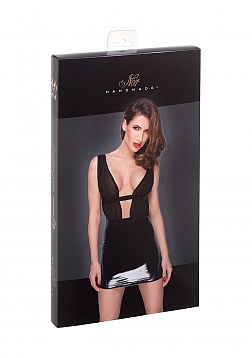 Fancy mini dress with PVC skirt and chiffon top has elastic, comfortable velvet trim and belt. On the back it's fastened with hooks. Shiny, enchanting skirt has a hidden zipper on the side.