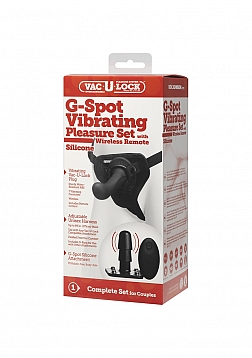 Good vibes only. The G-Spot Vibrating Pleasure Set includes everything you need to have a stimulating, satisfying strap-on experience. A USB-rechargeable vibrating Vac-U Plug featuring a 7-function built-in vibrator and wireless remote tucks perfectly into the harness to turn any attachment into a powerful vibrator. The silicone attachment features a curved design for g-spot stimulation, and the unisex harness is adjustable and padded for comfort. Everything in this set can be used together or with any other Vac-U-Lock compatible product. Vac-U-Lock is the world's first and only patented pleasure system, revolutionizing harness play and offering endless possibilities to mix and match within your collection to build the perfect toy.