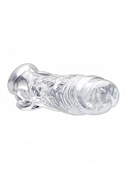 This veiny, lifelike penis enlarger offers instant results while remaining securely in place. It provides an instant boost to both girth and length, with a realistic textured outer sleeve that looks just like the real thing. The clear material allows you and your partner to see through to your excited shaft within. The firm, slickness inserts easily, while the devided shaft and ball chambers provide separation and security. Now you can enjoy enhanced performance and a tight fit, without any creams or schedules to follow. Just lube up and slip inside your new larger, harder, better cock!