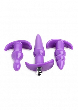 Excellent for adventurous beginners to backdoor play, this vibrating anal plug set includes three stimulating shaped plugs and a buzzing bullet vibe. Explore anal pleasure with 10 modes of vibration, including 3 speeds and 7 pulsating patterns. Just slide the petite bullet into the base of the plug you want to play with, whether you feel like a classic shape, an exciting bulb, or three pops of pleasure. Each plug is smooth and tapered for your comfort. The easy-to-use button operation makes playtime hassle-free and the contoured bases keep each plug safely in place between your cheeks. This firm, yet flexible material is phthalate-free and compatible with water-based and silicone lubricants. The bullet is even waterproof for easy cleaning or use in the shower.