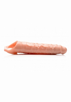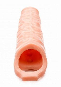 Wrap the strap around your scrotum for more support, security, and sensitivity! Gain three inches of solid length and about an inch of girth with this penis enhancing sleeve! The firm, but flexible material feels realistic, with a bold head and bulging veins all down the shaft. Just lube up and shove your dick inside to give your partner a new sensation to try out during sex! The solid 3 inch tip is followed by a hollow interior that allows for a snug and secure fit. You will love the huge nubs massaging your member on the inside. This phthalate-free and body-safe material is compatible with silicone and water-based lubricants. Use warm water and mild soap or a toy cleaner to clean after use.