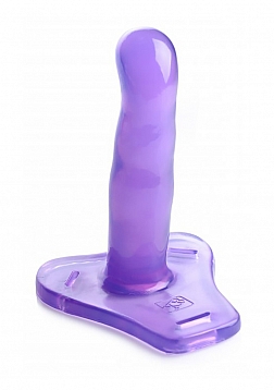 This all-in-one strap on set includes a sexy harness and an ample dildo. The harness features a T-back design that shows off your assets, and double D-ring buckles to adjust the straps at three different points to the perfect size for comfort and security. A sturdy base plate on the dildo ensures maximum control, allowing it to feel like an extension of your body. The dong itself is smooth and sleek, with a curved, bulbous head and subtle swells along the shaft. At seven inches in length, and nearly an inch and a three-quarters in girth, this dildo is not necessarily ideal for penetration beginners, but the simple design does favor those who are new to pegging or female-female strap-on play. This material is compatible with silicone and water-based lubricants and can be cleaned after use with mild soap or toy cleaner.