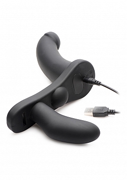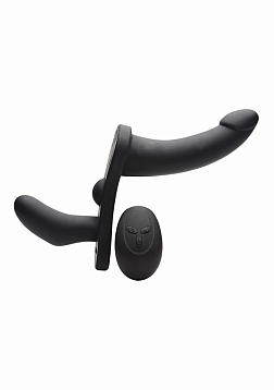 Get as much out of it as you put in! This double-ended dildo and harness set treats both of you to remote-controlled vibration. Explore 3 speeds of thrumming and 7 patterns of throbbing from the dual motors - one for you, and one for your partner. Place the longer dildo through the hole of the minimalistic harness, allowing the wearer to insert the smaller portion, which is curved to reach for the G-spot. A raised nub on the exterior is designed to provide clitoral stimulation. The longer dildo is also curved, and features a bulbous head to massage the receivers P-spot or G-spot. The remote control makes it easy to cycle through the 10 settings without having to pause penetration.