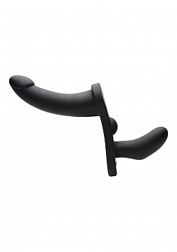 The seductive harness as 2 points of adjustment to ensure a perfect fit. The double-sided dildo is made of premium silicone, making it non-porous and phthalate-free, but not compatible with silicone lubricants. This pleasure tool is rechargeable and waterproof. Clean with mild soap or toy cleaner.
