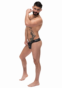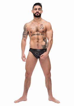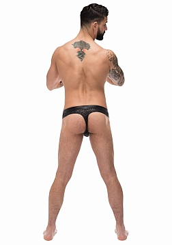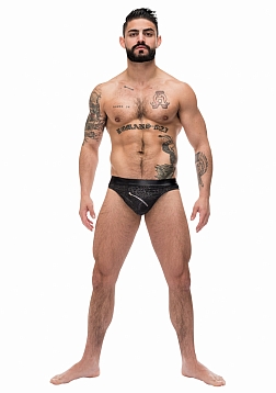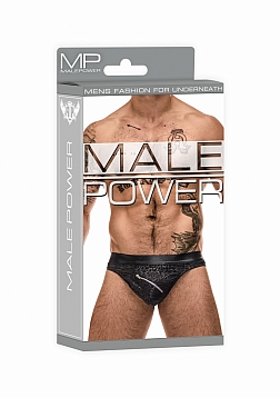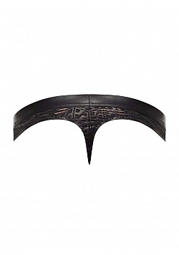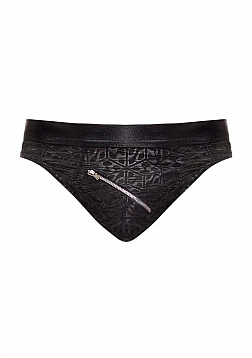 Zip Thong features a diagonal pouch zipper with protective flap, contoured pouch, slimming wet look waistband. Semi Sheer burnout fabric with a tone on tone abstract pattern. Lightweight and breathable with all way stretch.