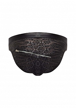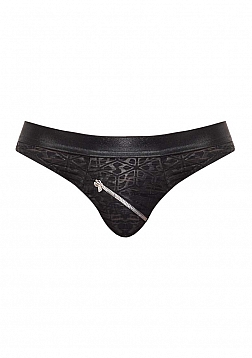 Zip Bikini features diagonal zippers on pouch and rear with protective flaps, contoured pouch, slimming wet look waistband. Semi Sheer burnout fabric with a tone on tone abstract pattern. Lightweight and breathable with all way stretch.