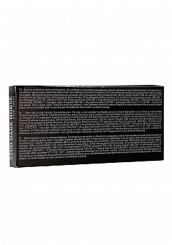| Ingredients | Ingredients per 3 tablets: Cellulose (filling agent), 300 mg Siberian ginseng (Eleutherococcus senticosus), 240mg Panax ginseng, 200 mg Tribulus terrestris, 200 mg L-Arginine, 50 mg Damien leaf (Turnera diffusa), 50 mg Sarsaparilla root (Smilax officinalis), 50 mg Ashwaganda root (Withania somnifera), 50mg Muira Puama extract (Acanthea virilis), emulsifier: E468, 30 mg Vitamin E (DL-alpha-tocopheryl acetate) (250% RDA *), emulsifier: E572, anti cacking agent: E551, 10 mg zinc (zinc oxide) (100% RDA *), emulsifiers: E463, E464, 6.6 mg Vitamin B5 (calcium D-pantothenate) (110% RDA *), solvent: E1518, 1.8 mg Vitamin B6 (pyridoxine hydrochloride) (129% RDA *), 0.9 mg Copper (copper (II) sulphate) (90% RDA *), 30 μg Selenium (selenomethionine) (55% RDA *), glazing agent: E903, colour: E133 *RDA = recommended daily amount. |