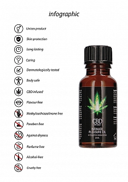 This relaxing oil absorbs extremly well into the skin while nourishing and moisturising at the same time. The CBD ensures an enhanced and super stimulating experience. Just apply a small amount to the desired area and repeat when needed. It will leave you with a wonderfully relaxed feeling. The CBD Intimate Pleasure Oil contains both hemp seed oil and CBD extract, which makes it an almost completely plant based oil mixture. It has no artificial fragrance and is completely free from preservaties such as parabens.