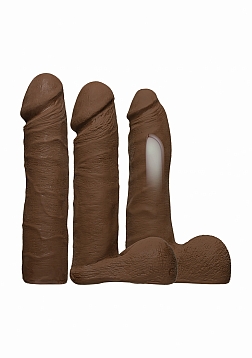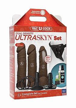 Your perfect strap-on experience is on lock with Doc Johnson's deluxe line of full-service Vac-U-Lock™ Harness Sets.  The Vac-U-Lock Dual Density ULTRASKYN™ Set is a solid investment for upgrading or beginning your strap-on accessories collection, offering multiple options in one box via a complete harness with removable o-rings and plug, three ULTRASKYN™ attachments, and a bottle of Mood water-based lube. These lifelike dual density attachments—an 8" Realistic Dong, a 7" Cock, and the bestselling 7" Slim Cock-- warm to body temperature with use and feature a soft, pliable exterior that gives way to a firm inner core, recreating the feel of a real erect penis.   Attachments can be used with the harness, the included Vac-U-Lock™ suction cup, and any other accessory or harness in the line. The Vac-U-Lock™ Dual Density Starter Set also includes Doc Johnson® Natural Toy Cleaner and ULTRASKYN™ Refresh Powder to properly and hygienically maintain your dual density ULTRASKYN™ attachments. Every product in the patented Vac-U-Lock™ system is designed to help you create any strap-on or toy you're in the mood for, and it's as simple as popping on the attachment of your choice.