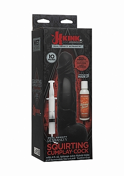 Ready to get wet? The Squirting Cumplay Cock's handheld syringe control lets you bust a load on command anywhere you can imagine. Fill it with the enclosed bottle of Splooge Juice (a hybrid glide formulated to look and feel just like the real thing), warm water, your favorite lube, or something more personal...the only limits are your limits. Handcrafted in lifelike ULTRASKYN, this massive 10 inch monster warms to body temperature in use, and the soft squeezable exterior yields to a firm corefor the most realistic experience possible. The Squirting Cumplay Cock is also Vac-U-Lock compatible, and includes a Vac-U-Lock suction cup to turn any smooth, nonporous surface into your own Kink.com set. Kink by Doc Johnson is an exciting collaboration with Kink.com to create a collection of high-quality authentic fetish items suitable for long-term practitioners and new initiates alike.