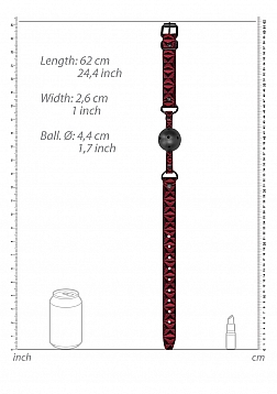 Silence your partner with this OUCH! Ball Gag, which is perfect for beginners and experienced bondage players alike. This tough phthalate-free ball gag comes with metal O-rings and has an adjustable buckle featuring 9 holes for easy adjustment. It measures 62 cm (24.4") in length and 2.5 cm (1.74") in width. The ball has a diameter of 4.4 cm (1.74"). Made from neoprene and faux-Leather, with an exquisite diamond pattern.