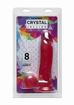 The Crystal Jellies 8-Inch Realistic Cock with Balls features a lifelike phallic shape complete with realistic veins and skin texture. From the firm head to the plush, squeezable balls, the sheer body-safe material shimmers in an assortment of beautiful crystalline tones. The wide base of this product ensures safety during any kind of play, while a built-in suction cup base seamlessly enables hands-free fun.